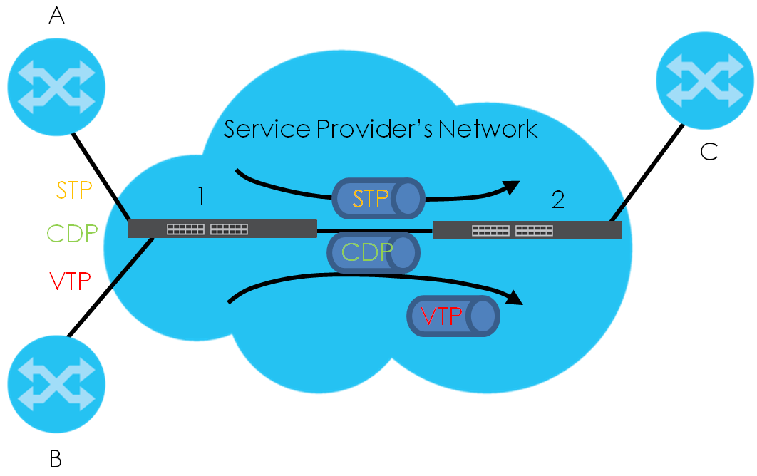 Point to Point | The Switch supports PAgP (Port Aggregation Protocol), LACP (Link Aggregation Control Protocol) and UDLD (UniDirectional Link Detection) tunneling for a point-to-point topology. Both PAgP and UDLD are Cisco’s proprietary data link layer protocols. PAgP is similar to LACP and used to set up a logical aggregation of Ethernet ports automatically. UDLD is to determine the link’s physical status and detect a unidirectional link. |