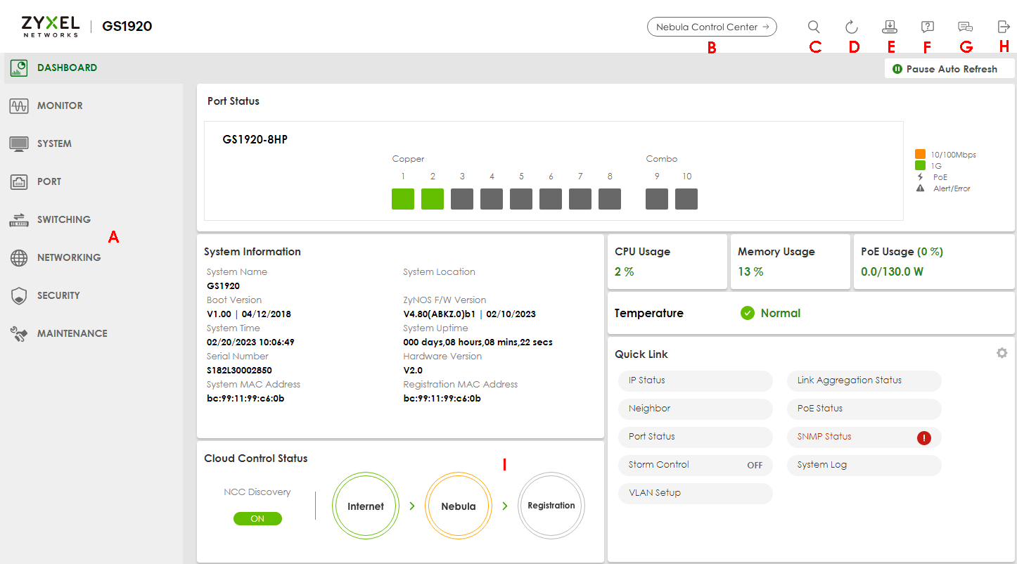 Cloud Management | This link takes you to a screen where you can enable or disable the Nebula Control Center (NCC) Discovery feature and view the NCC connection status. If Nebula Control Center (NCC) Discovery is enabled, you can have the Switch search for the NCC (Nebula Control Center). The screen also displays a QR code containing the Switch’s serial number and MAC address for handy registration of the Switch at NCC. |