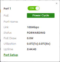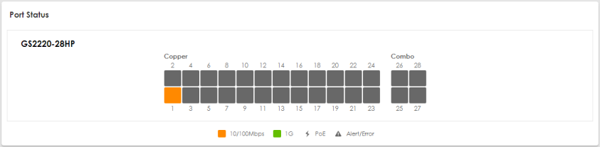 Port Status | This displays individual port type, status, and connection speed of the Switch. Click on a port to open the port’s status panel. Use the status panel to enable/disable a port, power cycle a PoE port, and view its basic information. For example, link speed and port utilization. |