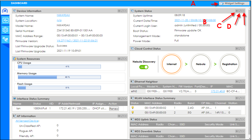 Widget Settings (A) | Use this link to re-open closed widgets. Widgets that are already open appear grayed out. |